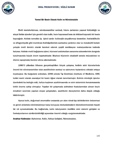 Anahtar Kelimeler: Alzheimer, Kolin, Hafıza Gelişimi, Nörotoksisite.