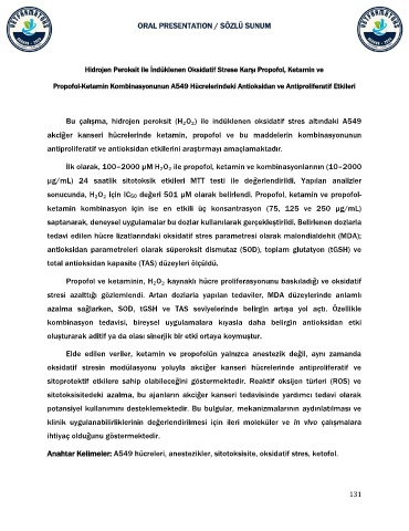 Anahtar Kelimeler: A549 hücreleri, anestezikler, sitotoksisite, oksidatif stres, ketofol.