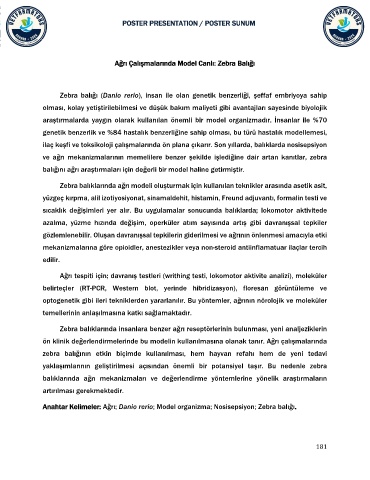 Anahtar Kelimeler: Ağrı; Danio rerio; Model organizma; Nosisepsiyon; Zebra balığı.